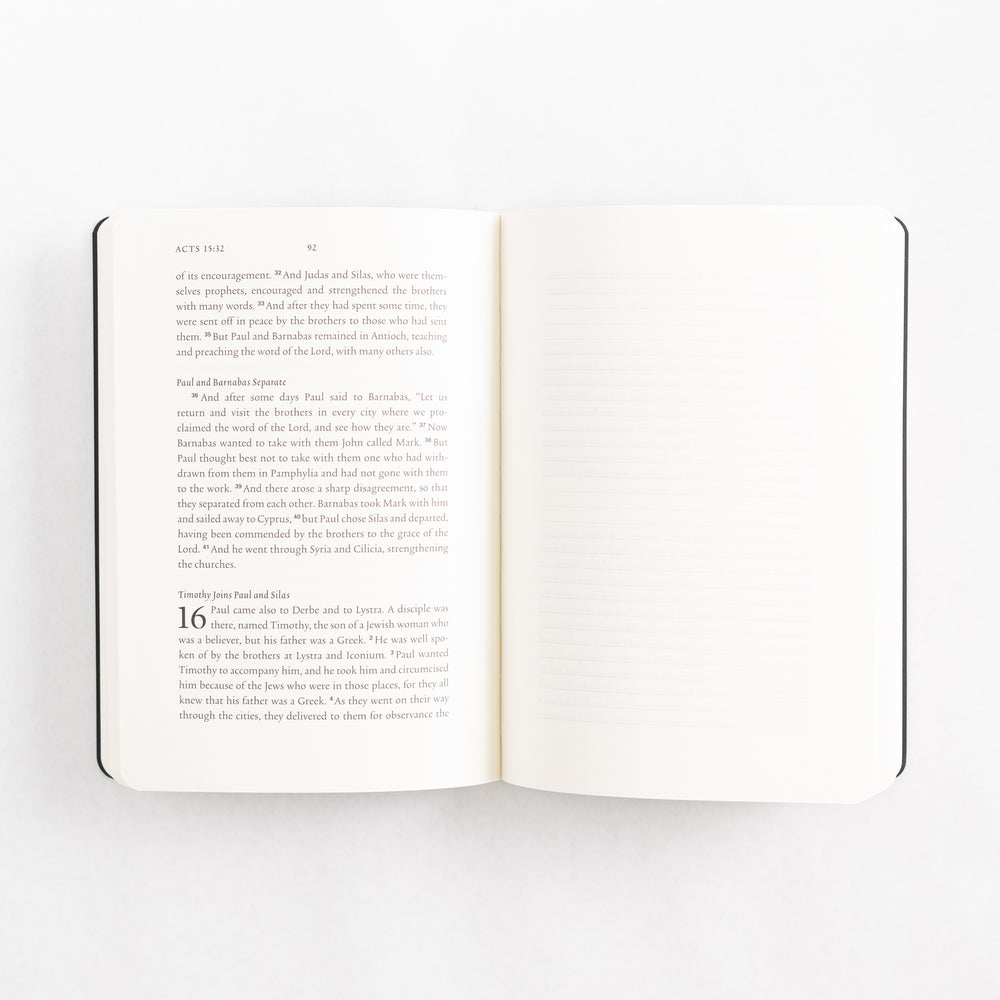 ESV Scripture Journals pair the entirety of individual books of the New Testament with lightly lined blank pages opposite each page of the biblical text, allowing readers to take extended notes or record insights and prayers directly beside corresponding passages of Scripture. This edition features the book of Acts, and is thin and portable—great for personal Bible reading and reflection, small-group study, or taking notes through a sermon series.