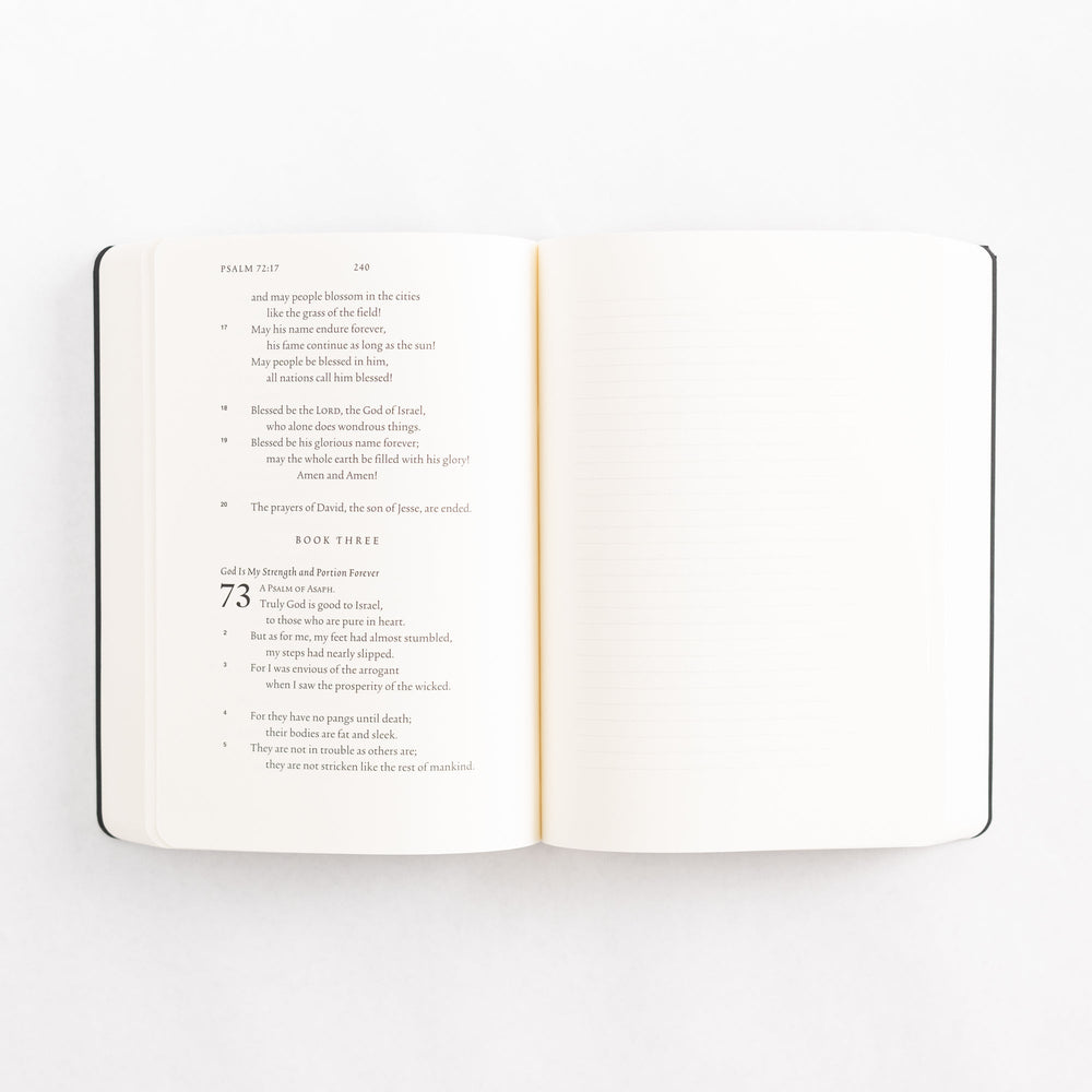 ESV Scripture Journals pair the entirety of individual books of the New Testament with lightly lined blank pages opposite each page of the biblical text, allowing readers to take extended notes or record insights and prayers directly beside corresponding passages of Scripture. This edition features the book of Psalms, and is thin and portable—great for personal Bible reading and reflection, small-group study, or taking notes through a sermon series.